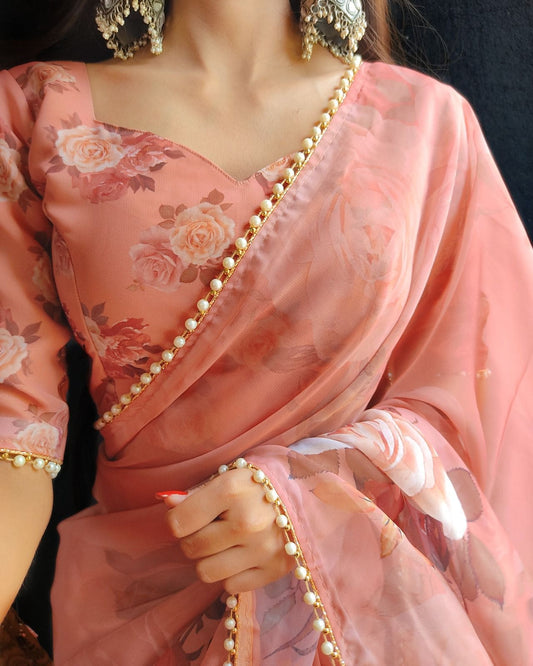 Georgette Printed Saree With Pearl Lace Border