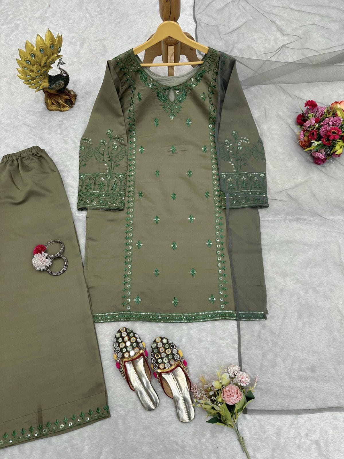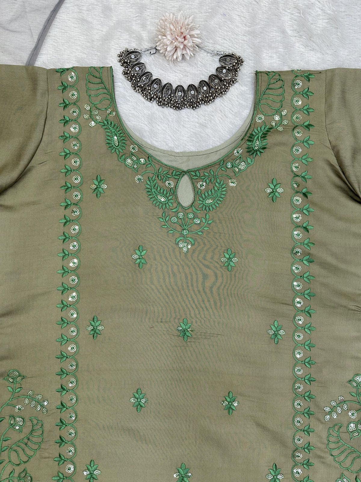 Beautiful designer suit on muslin cotton fabric with inner and thread with sequence work and palazzo on muslin fabric with thread work and dupatta on organza silk fabric.