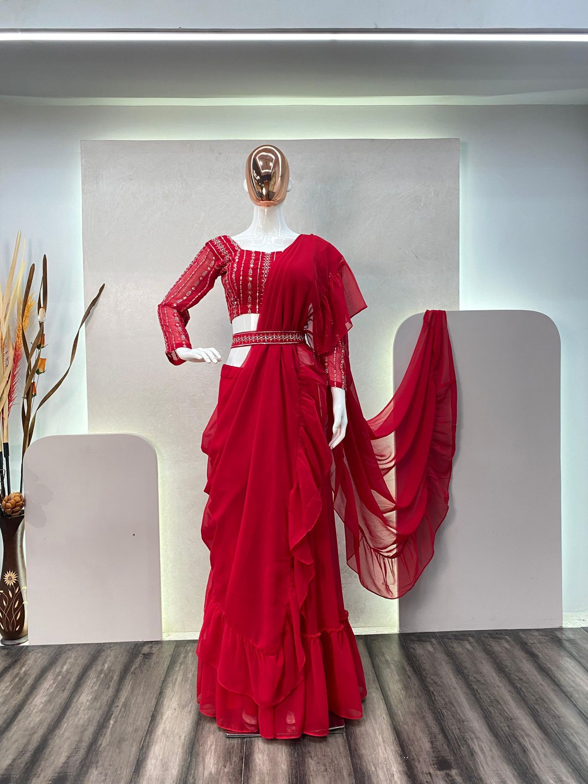 Boutique Style Exclusive Fancy Party Wear Faux Georgette Work Lehenga Saree With Heavy Work Blouse And Belt